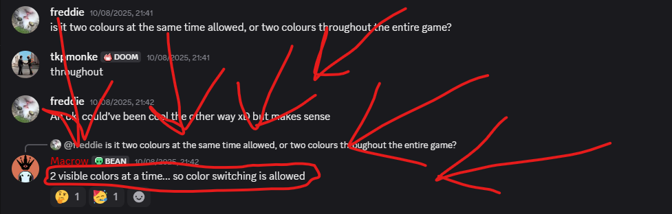 As you can see, this game violently flashes different colours on screen. But is this allowed with the 2 colour limit of the jam? Yes, as you can see below, Macrow (host of the jam) has repeatedly clarified that the limit is 2 colours per frame and as the game only ever displays 2 colours per frame, it is allowed.